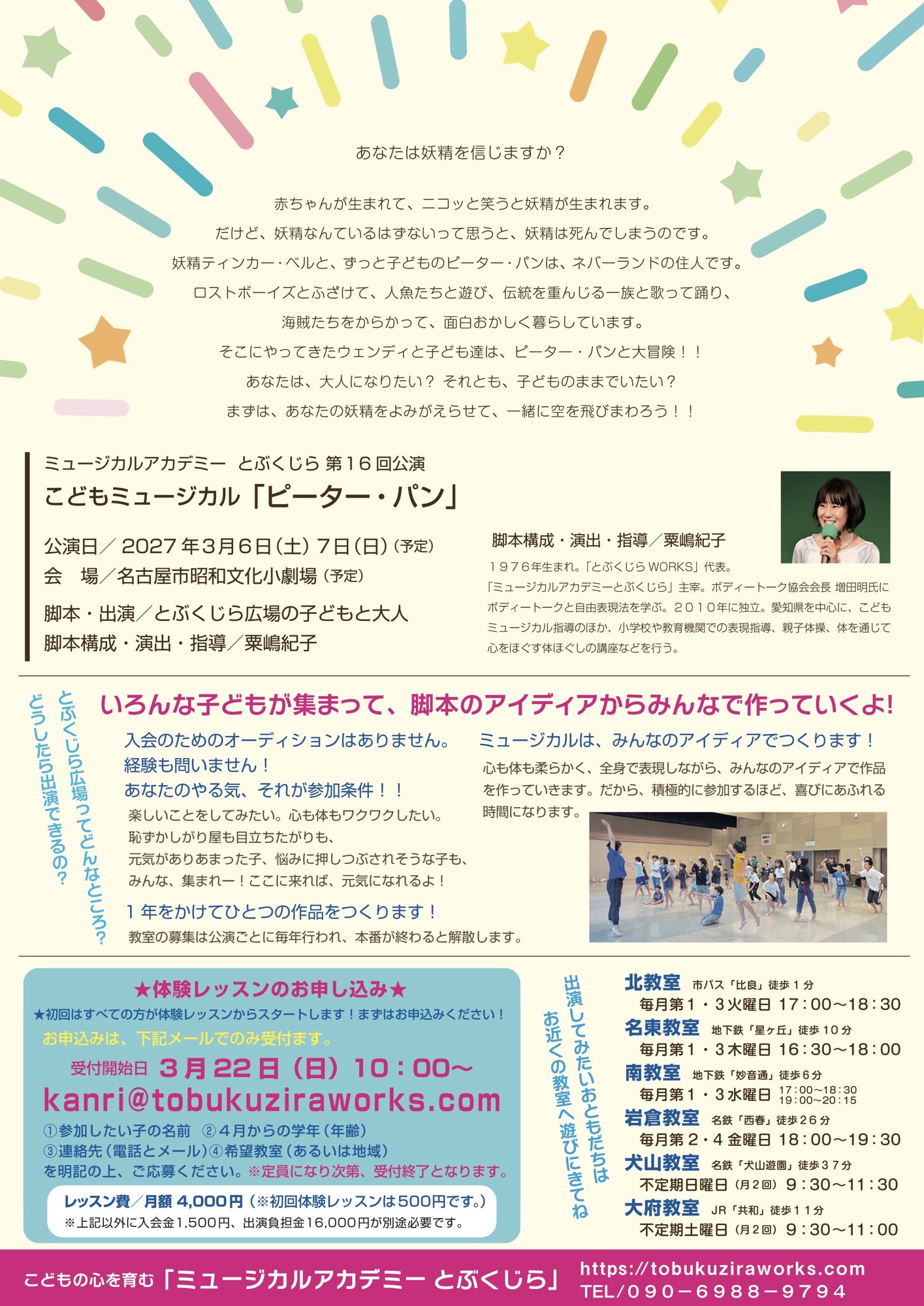 2026年3月21日 / 最終更新日 : 2026年3月21日 tobukuzira_info 募集 体験レッスン受付 『ピーターパン』体験レッスン受付は、3/22の10時から、メールのみです。 10時に来たメールから順に受付をし、定員になり次第、受付終了です。 時間外の早いメールは、受付できませんので、ご了承ください。 Follow me!